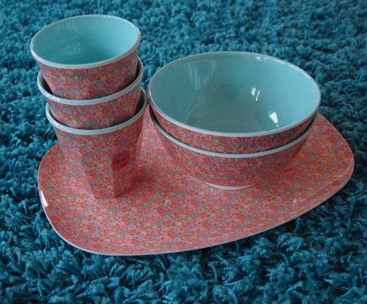 Supersöt ny skål med småmönstrat blommigt i corall, rosa, blått & grönt...insida i ljusblått.