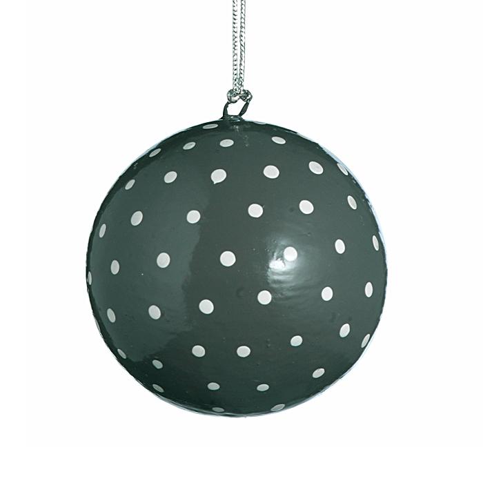 NYTT hos oss - Madam Stoltz! Jättefin prickig julgranskula av papier maché i en grågrön ton - mixa gärna med de röd & vit prickiga! Med hänge.